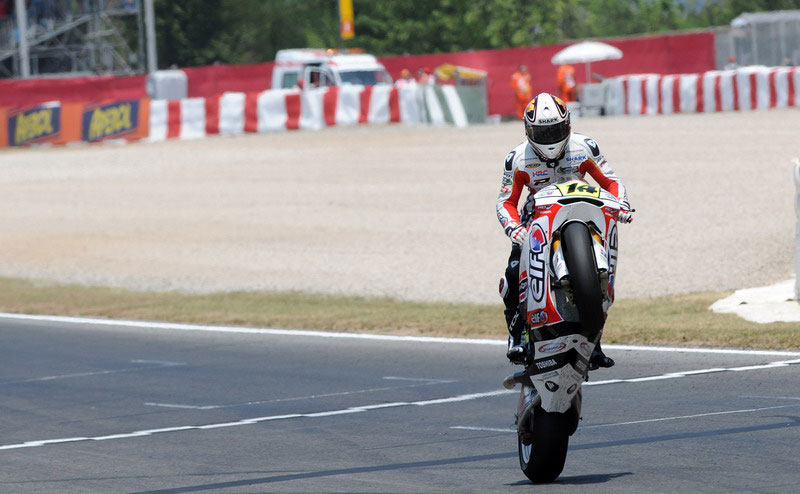 Last year Valentino Rossi mugged Lorenzo on the last corner to take one of the closest wins in history. This year the Doctor isn't here, so that's one threat less for Lorenzo to worry about. Not that it seemed to make much difference to the Spaniard as he utterly dominated both free practice sessions, with Pedrosa and Stoner taking a turn each at the second and third steps on the leaderboard. Dovizioso, de Puniet, Spies and Espargaro all made forays toward the top end, as well, showing that although the field is numerically small there is a wide range of talent on tap.