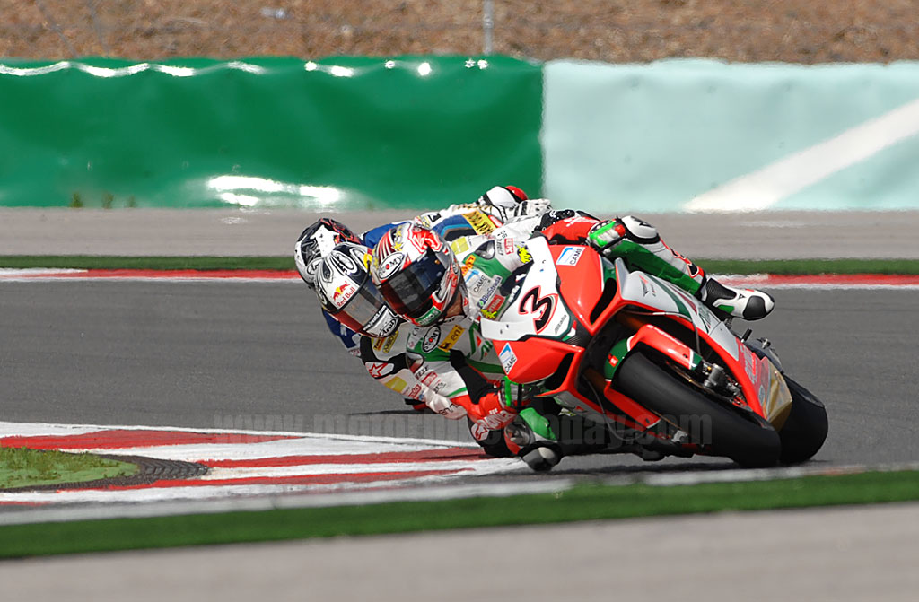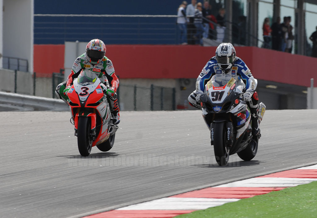 But at the end of the race it was the sheer speed of the Aprilia that gave Biaggi the first double of the season, and his first ever SBK double as well, from Haslam and Crutchlow. Checa was a fine fourth, and ten there was a two second gap before Leon Camier brought the second Aprilia home in his best position so far, a massive six seconds ahead of james Toseland, the former champion's efforts hampered by his still broken hand. A couple of seconds behind Toseland, Shakey Byrne took a respectable seventh on the second Althea Ducati, a comfortable couple of seconds clear of Haga on the first factory Ducati. Guintoli and a frustrated Corser rounded off the top ten.