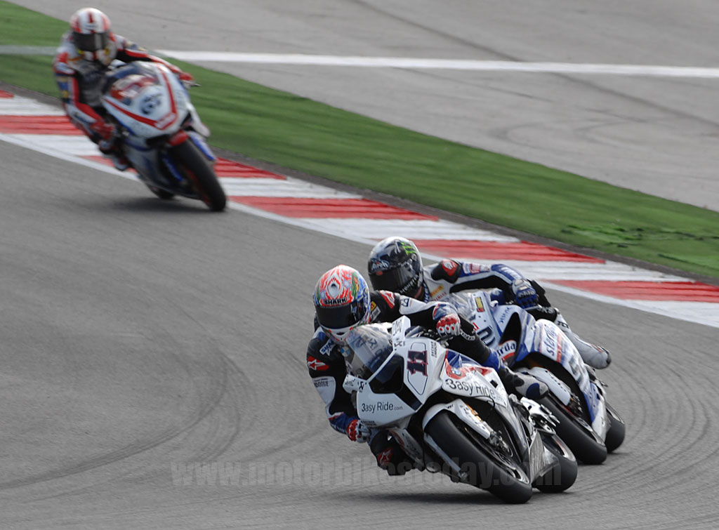 Race Two was slightly breezier, and the air temperature remained the same despite the sunshine. Track temperature, too, was still comfortable, and everyone was now happy about where the track went and what they could do. We were treated to something of a carbon copy as the lights went out, because once more it was Biaggi who got the holeshot to take the lead from a extremely fast Jonathan Rea, again with Haslam and Crutchlow nipping at their heels. Yet again, Troy Corser made a strong start, putting the BMW into fifth place ahead of Leon Camier and Carlos Checa. Everyone got through safely this time, though the field remained pretty bunched up for a while. Johnny Rea mad a lunge past Biaggi on lap two but wasn't able to make the break, though the Honda was certainly going well. Not well enough, it seemed, because Biaggi simply blasted past on lap three to take the lead back. And immediately behind the pair of them, Leon Haslam was closing, patiently waiting for the opportunity to strike. Behind Haslam, Cal Crutchlow was also closing up, with Troy Corser in the tow behind. And further back, Carlos Checa was on the move, slicing past Leon Camier on lap two and despatching Corser one lap later. Further back yet, Haga made a slow start, only gaining a few places and actually being passed briefly by Fabrizio before asserting himself again and resuming his gradual climb up the field. Ahead of them, James Toseland made a better start, passing Guintoli and Xaus on the second lap and making steady progress. Troy Corser again found himself falling victim to the BMW's lack of staying power, steadily falling back from his strong first few laps showing. The Australian rider is still pushing as hard as ever and there's certainly no lack of commitment there, if only the bike would last out.