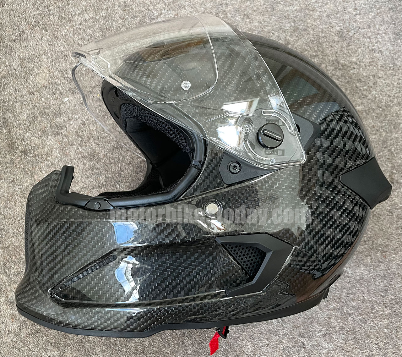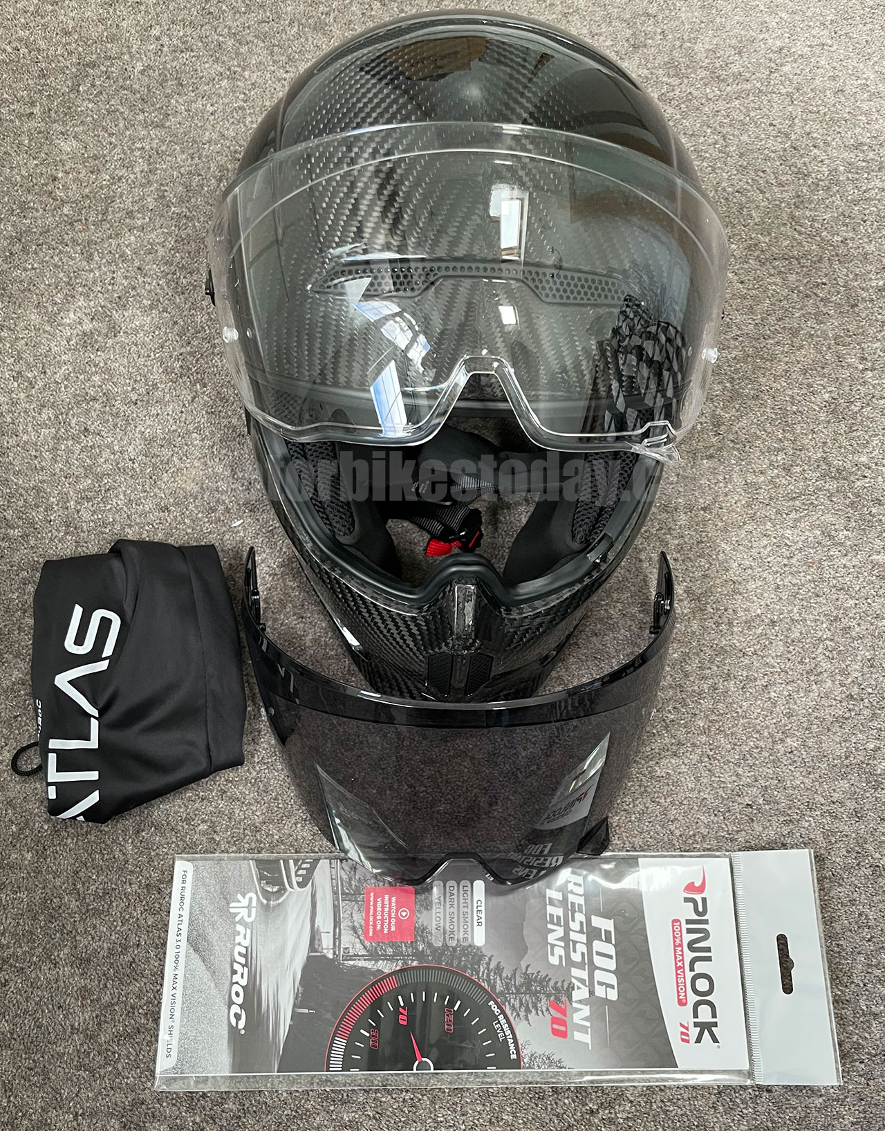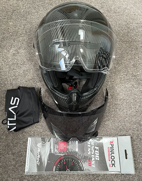 The Atlas 3.0 arrives in beautiful box, and includes a very good quality helmet bag, smoked and clear visors (with an extremely useful visor bag) and a pinlock insert. Lifting the helmet out, first impressions are very good indeed. It’s light but solid feeling, the carbon weave is neat and uniform, and the lacquer has a beautiful deep gloss. The visor fittings are simple and neat, and the visor mechanism is positive.