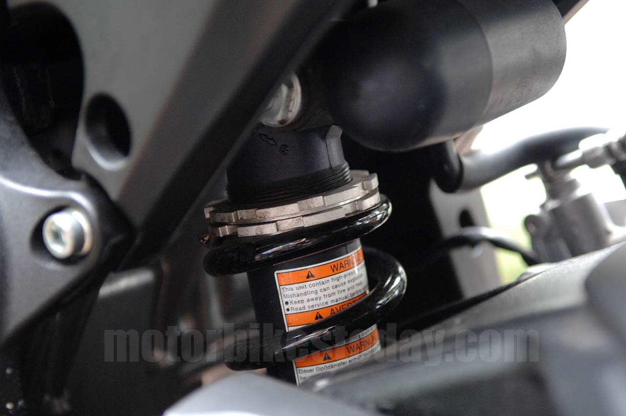 We’ll assume it’s just you normally on the bike. Don’t do this in shorts and tee shirt with an empty fuel tank. There’s no need to be in full kit, but at least get vaguely close to riding weight and have at least half a tank on board as well, as there’s probably around a quarter of your weight in liquids when the bike is fully wet, and that’ll make a difference. Now get on the bike and get the two assistants who aren’t measuring to balance it while you put your feet on the pegs and get into your normal riding position. They need to be just balancing, though, not lifting and not pushing down. Bounce up and down a few times (let them know you’re doing it first as taking them by surprise could be embarrassing, potentially injurious and expensive) to be sure the suspension has settled. And then get your measurer to do their stuff again. The difference between the two measurements will be your One G, or loaded, static sag.