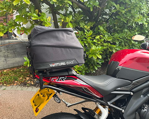 And so I ended up with this. The Ventura Evo pack works on the same principal as the original, but manages to be less intrusive, especially when you don't have the bag on the bike, just the rack. Instead of the bag dropping over a large vertical hoop, it slides onto the rack and is secured at the back by two adjustable clips. Take the bag off and either fit a GoPro to the rack or replace the rack with a grabrail for your brave, bendy and possibly slightly insane pillion.