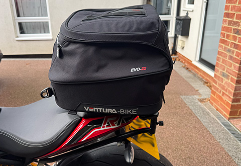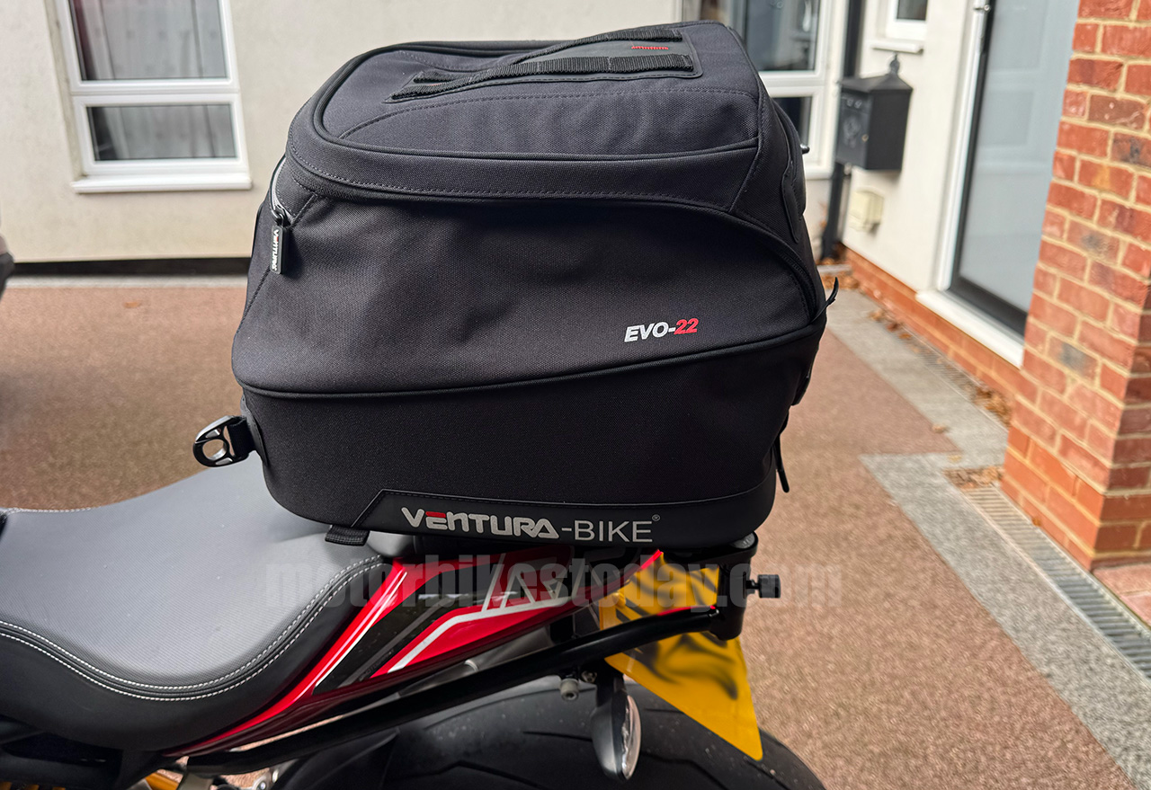 There are many may warnings about the maximum speed you should ride at with a loaded bag on the back. All I can say here is that riding solo with the bag over the pillion seat I genuinely never noticed the bag was there. It made no difference whatsoever to handling or stability, regardless of pace. And of course because it's narrow and secure you don't worry about filtering through traffic or losing it when you hit a bump.