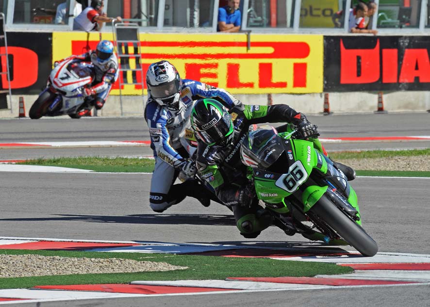 Though the action was close, hard and exciting, positions remained fairly static at the front for the next few laps as Haslam pushed hard but Sykes used the excellent braking and acceleration of the Kawasaki to its best advantage. Haslam could carry higher corner speed and was no doubt capable of going faster overall, but with the big green machine in the way there was nothing he could do to exploit that fact. Getting desperate, he pushed hard into a corner, lost the front slightly and went across the gravel, joining a couple of places back behind the hard charging Carlos Checa. Biaggi too had a major gravel moment, nearly collecting Cal Crutchlow as he rejoined in all sorts of trouble, back in thirteenth.