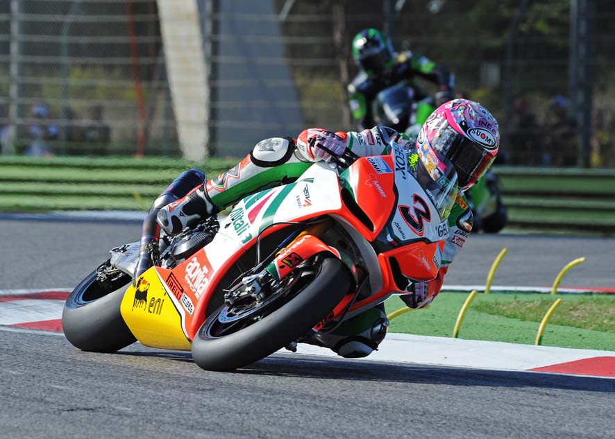 James Toseland had meanwhile fought his way up to a highly respectable sixth and was looking good when the Yamaha broke, forcing his retirement. But it was Checa who was really the man on the move, going from ninth on the grid to third by lap eight. Even more of a surprise, Lorenzo Lanzi, former factory Ducati rider who has in all honesty done very little to distinguish himself since getting that ride back in 2005, was now all over the back of Sykes' Kawasaki and challenging for the lead. In fact, a lap later he drifted past and set about making a gap. Three laps later, Checa also passed Sykes as the Kawasaki overwhelmed its tyres and started heading backwards. Sykes may not have been going to get a podium but he was by far the most spectacular rider to watch as he drifted the Kawasaki through Imola's swooping curves in beautiful style.