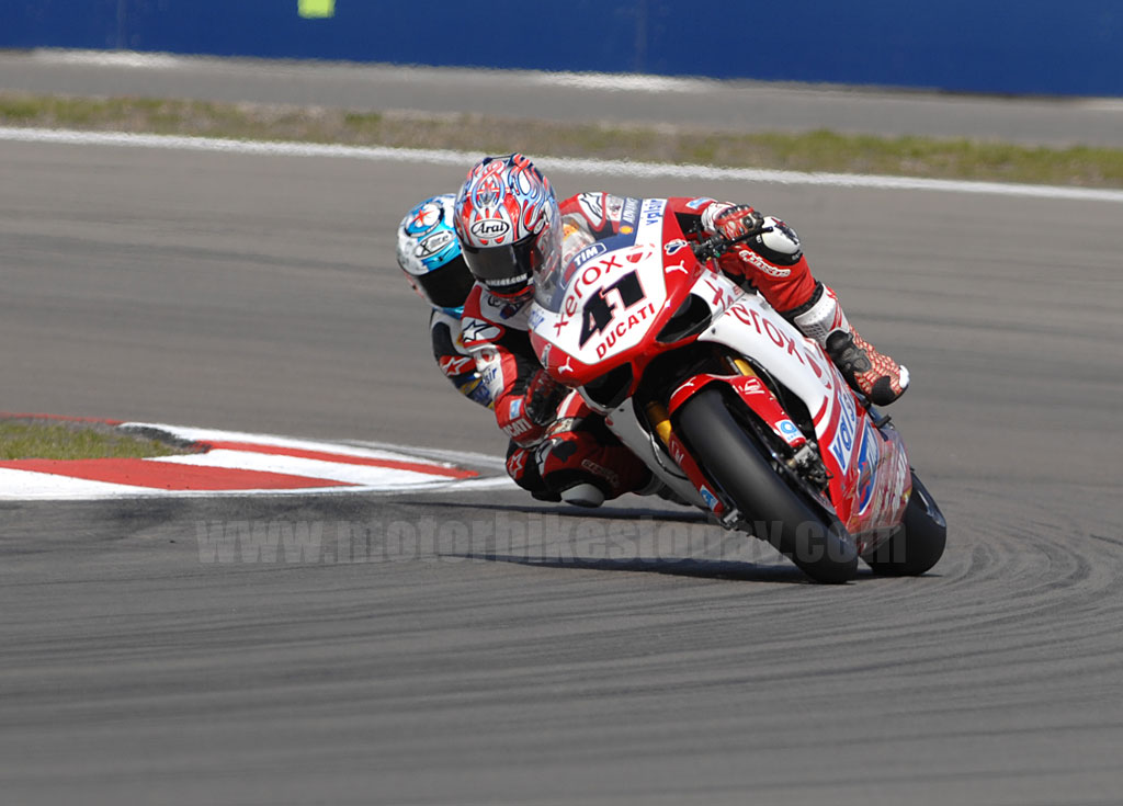Having given himself a mountain to climb again, Leon Haslam prove well up to the task, climbing back up to third as Sykes dropped back and then remorselessly hunting down and passing Lanzi three laps later. Then it was time for Checa to come under pressure. As the veteran Spaniard should have been expecting things to ease off as tyres degraded, Haslam was upping the ante and closing fast.The last five laps of the race were as close as we've ever seen, and on the last lap it looked certain that the Englishman would get through to take the win as he was so much stronger on the brakes. But as he dove down the inside of Checa at the left hand Rivazza curve, he again locked the front briefly, having to pick the bike up and take to the gravel in order to avoid a crash. So Checa sailed through to take a clear lead, followed by Lanzi, Haga (who had been quietly picking other riders off on his way through the field) and Smrz. Haslam recovered to finish fifth, ahead of Sykes. Max Biaggi picked up just five points for an eleventh place finish, leaving the championship still quite open as Haslam's eleven points helped close things down. Early front runner Corser finished fifteenth as the BMW struggled for grip on worn tyres.