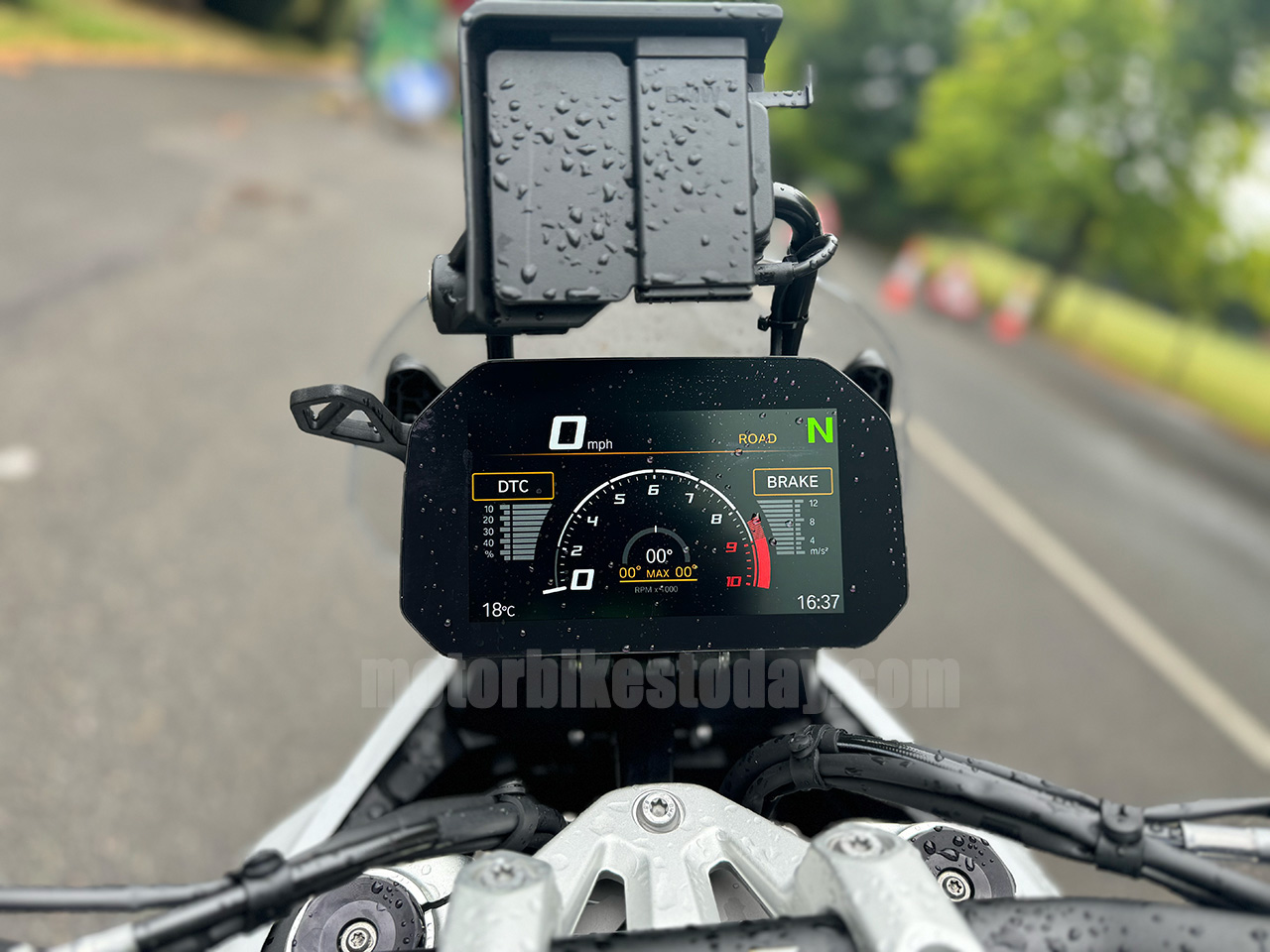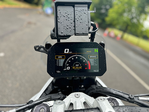 The screen works well. It's manually adjustable (electric option available, of course) and in its lower position pushes just enough air to be a help. Raised, it makes a reasonably effective bubble. There is no turbulence. The Dynamic Pack gives riding modes which tweaks suspension settings and throttle map according to half a dozen presets and offers you the facility to completely muck it up in a custom way as well. Mirrors are excellent, largely vibe-free and well placed. They're wide enough but not too wide. Wider than the cylinders, mind, which is A Good Thing. Like mouse whiskers, if the mirrors will go through the gap, so will everything else. Clocks are a beautifully clear TFT screen with all the information you could possibly need and none you don't. The menus are accessed from the left bar switch and the big roller wheel - dead easy to use. Though the satnav wasn't fitted, the position of the (optional) cradle made it obvious that it would be easy to follow and previous experience says that it's straightforward to manage as well.